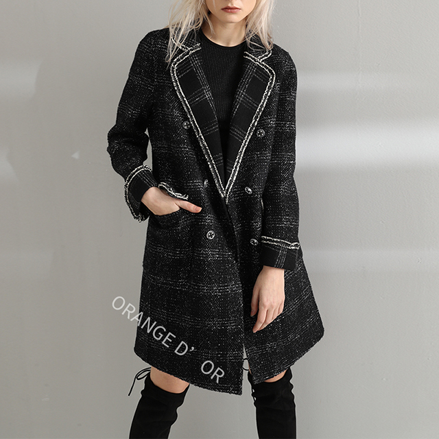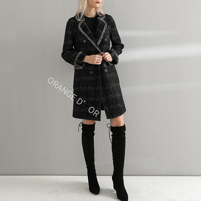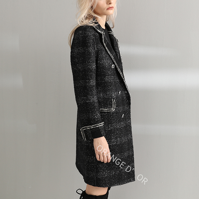 展品簡介:長款樣式,翻駁領(lǐng)領(lǐng)型,經(jīng)典雙排扣,雙側(cè)袋蓋式口袋設(shè)計(jì),